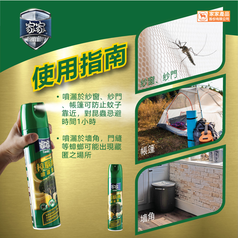 2. 適用範圍:噴灑於紗窗、紗門、帳篷可防止蚊子靠近,對蚊子忌避時間1小時。